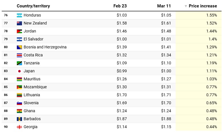 Kambodža je zabilježila najveći porast cijena benzina od gotovo 68 posto, sa 1,11 USD po litru 95-oktanskog benzina 23. februara na 1,32 USD 11. marta. Slijede Vijetnam sa 50 posto, Nigerija sa 35 posto, Laos sa 33 posto i Kanada sa 28 posto.